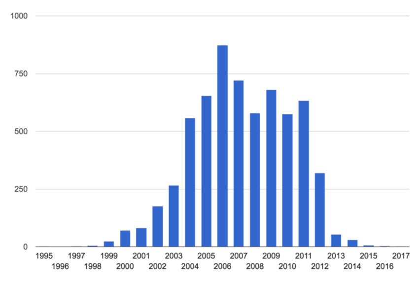 Рис. 2 Распределение количества фальшивых диссертаций (штук) по годам.