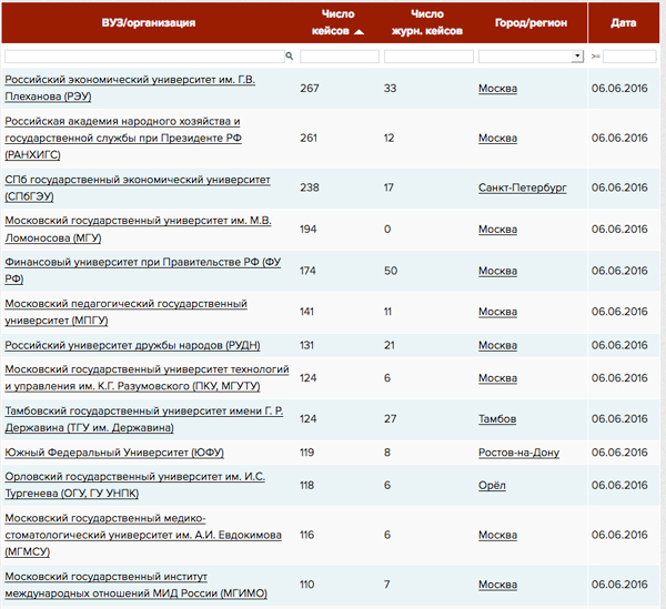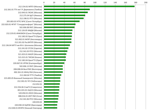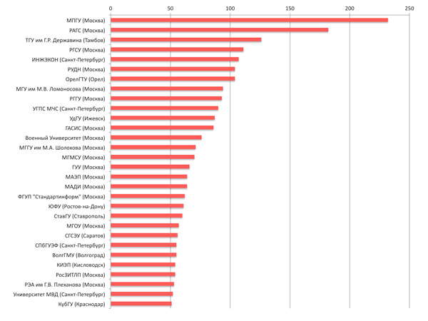 Рис. 6. Рейтинг вузов России по числу сотрудников с фальшивыми диссертациями.
