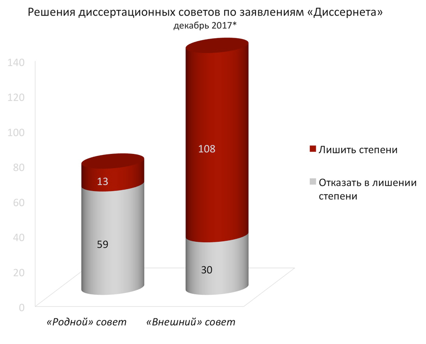 Рис. 7. Сравнение результатов рассмотрения заявлений о лишении степени в "родном" и во "внешнем" совете.