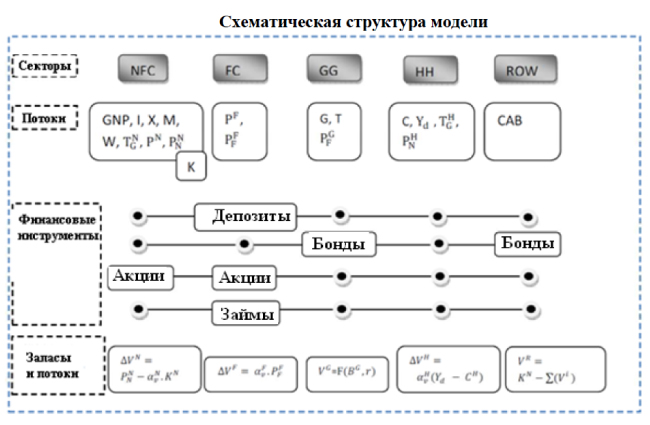 С.268 Модельная экономика разделена на четыре главных сектора: - «нефинансовые корпорации» (NFC), которые включают все частные фирмы, а также и другие корпоративные организации, - «финансовые корпорации» (FC), включают все финансовые учреждения и Центральный банк Российской Федерации, - «государственное управление» (GG) и «домашние хозяйства» (HH) стандартные, в то время как «остальная часть Мира» (ROW) описывает взаимодействия национальной экономики с нерезидентами. Ссылки нет