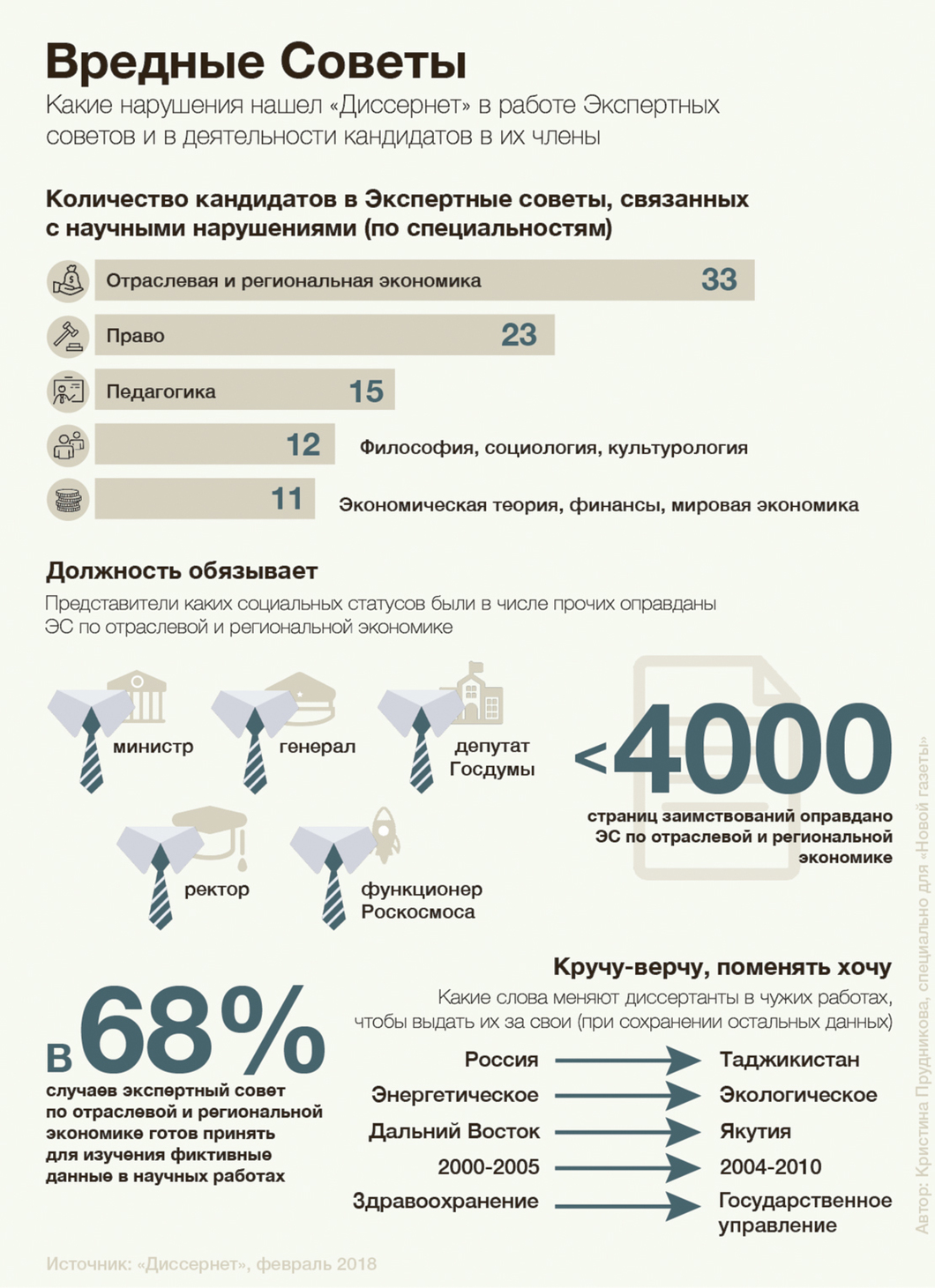 Сетевое сообщество «Диссернет», занимающееся поиском плагиата и других нарушений в научных работах российского истеблишмента и обычных граждан, 9 февраля представляет сразу два доклада, посвященных деятельности Экспертных советов (ЭС) по экономическим наукам в России в последние пять лет. «Диссернет» с 2013 года подал в Министерство образования 116 заявлений о лишении ученых степеней кандидатов и докторов наук. Однако когда рассмотрение заявлений проходило на уровне Экспертных советов, «Диссернету», как говорится в докладе, пришлось столкнуться с «совершенно удивительными по своему цинизму и мракобесию» реакциями экспертов того или иного совета. Это касается обоих ЭС по экономическим наукам, существующих при Высшей аттестационной комиссии: по экономической теории, финансам и мировой экономике, а также по отраслевой и региональной экономике.
