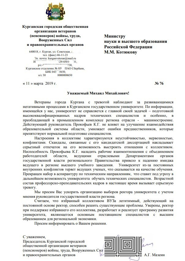 «Ветераны города Кургана с тревогой наблюдают за развивающимися негативными процессами в Курганском государственном университете. По информации, имеющейся у нас, университет не справляется с главной своей задачей — подготовкой высококвалифицированных кадров технических специалистов, и особенно в преобладающей в промышленном комплексе региона отрасли — машиностроении. Действующий руководитель Прокофьев К. Г. не влияет на улучшение взаимодействия образовательной системы области, умножает ошибки предшественников, которые препятствуют нормальной подготовке специалистов», — говорится в начале письма.